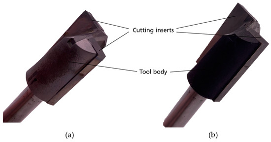 In this paper, two identical router tools (type: 2424-3-5-18097-R) from Jakob Schmid GmbH + Co. KG, Neresheim, Germany are investigated. The tool has a diameter of 18 mm and is equipped with two cutting inserts. The difference between the tools lies in the manufacturing process. One was manufactured by adhesive bonding with a heat-curing epoxy adhesive (Monopox HT2860 from the Company Delo Industrieklebstoffe GmbH & Co. KGaA, Windach, Germany), while the other one underwent a soldering process. The tool body is made of steel, and the cutting inserts are made of tungsten carbide. The tools are seen in Figure 1.