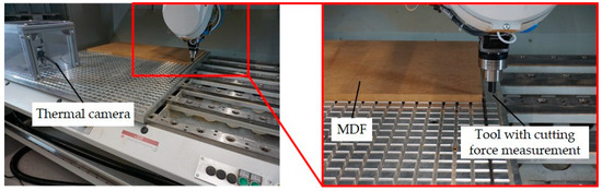 A thermal camera PI400i from Optris GmbH, Berlin, Germany was used for the temperature measurement of the milling tool on a measurement spot, the same for every temperature measurement. A Spike tool holder 1.2 from pro-micron GmbH, Kaufbeuren, Germany recorded cutting forces during the process. The experimental setup can be seen in Figure 2.