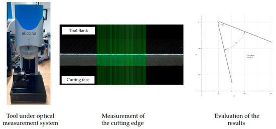 An Alicona Infinite Focus SL from Alicona Imaging GmbH, Raaba, Austria measured the cutting edge radius via an optical method. The procedure is shown in Figure 3. Wear was documented with a VHX7000 from Keyence Deutschland GmbH, Neu-Isenburg, Germany.