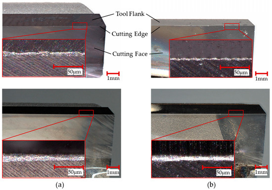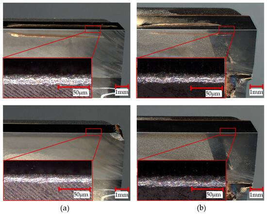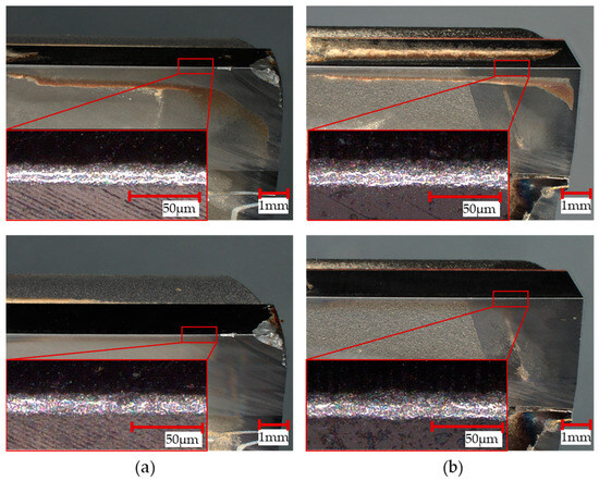 In Figure 6, the top of the image shows both cutting tools when new. The adhesively bonded tool is depicted on the top left-hand side (a), while the soldered tool is presented on the top right-hand side (b). Comparing the tools’ characteristics (tool flank, cutting face, and cutting edge), it can be seen that there is no visible difference in the cutting edge of the tools when new. Additionally, the images at the bottom show both tools after milling ten notches in a row. The images do not reveal any traces of wear. In addition, the details do not show significant differences between the two tools.