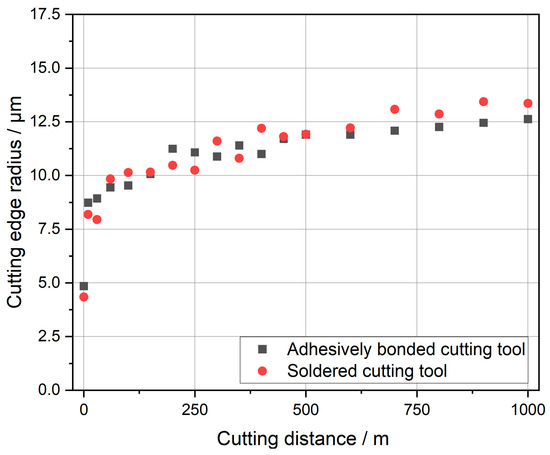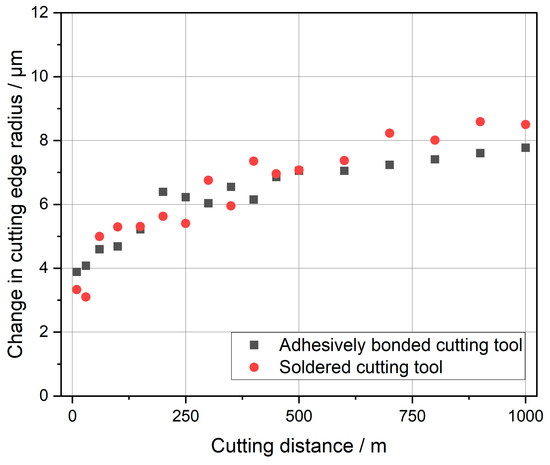 In Figure 9, the measured cutting edge radius is displayed. Both tools show a rising of the radius in a similar manner. Within the first few meters, the cutting edge radius changes very strongly. Starting at 100 m, the progression is almost linear. From a cutting distance of 400 m onward, the soldered tool consistently has a bigger cutting edge radius than the adhesively bonded tool. At the end of the experiments, the cutting edge radius for the soldered tool is noticeably higher. After 1000 m of cutting distance, the cutting edge radius of the soldered tool is 13.4 µm, and that of the adhesively bonded tool is 12.6 µm. The soldered tool experienced an increase of 8.5 µm in the cutting edge radius, while the adhesively bonded tool’s cutting edge radius only increased by 7.7 µm. For a simple comparison, Figure 10 shows the absolute change in cutting edge radius over the cutting distance.
