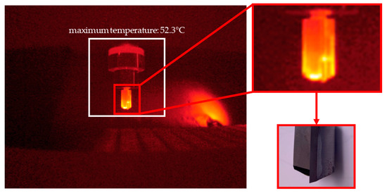 The temperature-measuring device operating with Optris PIX Connect Software (Optris GmbH, Berlin, Germany) always determined the highest temperature at the measuring point. The tool remained stationary for five seconds during temperature measurement. Yet, the measurement was not conducted at the exact same position. An example is pictured in Figure 11. In the portrayed white frame, the software determined the maximum temperature which was used for further evaluation. It can be seen that the tool heats up the most at the tip (which has the brightest color). A difference between the tool body and the carbide insert cannot be seen in the image.