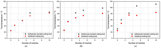 The results of the temperature measurements of the notches are shown in Figure 12. For the soldered tool, the temperature increase with every notch is almost comparable for all cutting distances. The difference lies within the first three notches. It is noticeable that with increasing cutting distance, the temperature within the first three notches rises faster. However, after ten notches, the tool temperature is similar for all cutting distances. For the new tool, it was 82.4 °C, after 500 m cutting distance, it was 81.0 °C, and after 1000 m cutting distance, it was 84.2 °C.