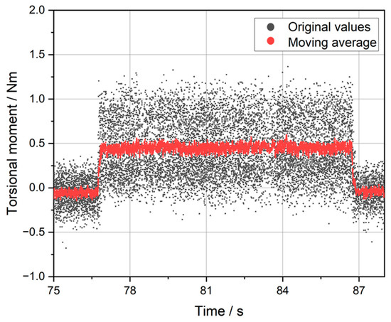For the analysis of the torsional moment, the data measured with the Spike tool holder were analyzed. During the notch-milling process, the torsional moments were determined. An example of measured torsional moments while milling a notch can be seen in Figure 13. Despite the presence of a significant degree of noise, the region corresponding to the notch is distinctly visible within the diagram. The notch starts when the torsional moment rises above 0.5 Nm and ends when the moment falls below 0.5 Nm. For better readability, a moving average (10 values before and after the set point) is additionally shown in the graph. The diagram shows how the area of interest in which cutting of notches was performed was identified. It also demonstrates that the torsional moments during notch milling did not experience a drift, neither rising nor descending, towards the end of the notch. Therefore, a mean value could be calculated to compare the different notches.