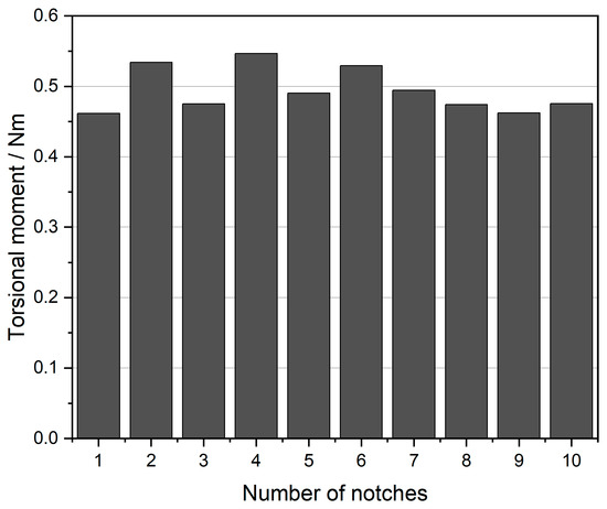For the sake of clarity, the mean value was calculated for the corresponding regions to compare different notches. This process was repeated for every notch after every cutting distance. An example of torsional moments of ten notches after 500 m of cutting distance can be seen in Figure 14. It can be observed that the mean value fluctuates slightly between the notches. No other anomalies could be identified in any of the analyzed data.