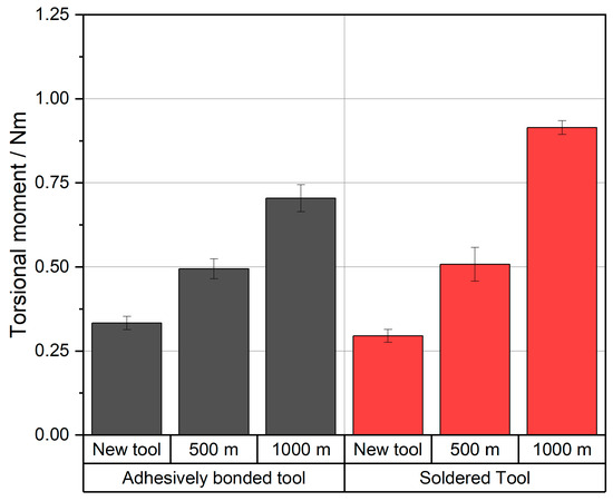 For better understanding of the development of the torsional moment over the cutting distance, the results of the individual notches were combined for each cutting distance and tool, and the mean average was calculated. The final result can be seen in Figure 15. It is noticeable that for the new tools and after 500 m of cutting distance, the torsional moments show similar results for the adhesively bonded and soldered tool. After 1000 m of cutting distance, the torsional moments for the soldered tool rose more than for the adhesively bonded tool.