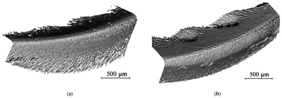 Figure 9, Figure 10 and Figure 11 show 3D images of the cutting edges of the plates before and after wear and their light sections obtained on the multifunctional optical measuring system MikroCAD premium+ (GFM, Teltow, Germany) after etching aluminum deposits in a warm (50 C) 10% solution of potassium hydroxide (KOH) when exposed to ultrasound. Figure 12, Figure 13 and Figure 14 show the state of the cutting edge after the plate reaches the established wear criterion of 0.3 mm and the distribution of Al and Si on the working surfaces of the cutter.