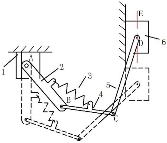 In line with the functional requirements of the mechanism, the lateral-rolling mechanism proposed in this study possesses a 2-DOF metamorphic mechanism. When the mechanism starts to move, the two links adjacent to the spring are fixed together under the constraint of the spring. At this time, the number of links in the mechanism changes, and the mechanism is one degree of freedom. When one of the links adjacent to the spring and the frame becomes one, the other link breaks free from the constraint of the spring force and starts to move; at this time, the mechanism also has a degree of freedom. Due to the special operating conditions, it is required to reduce the weight of the drive and simplify the control system. Therefore, only one actuator is used in the 2-DOF-constrained metamorphic mechanism.