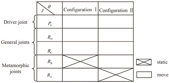 In matrix C, the columns correspond to the working configurations, and the rows correspond to the constrained structures matrix of metamorphic joints [30]. When compared to the constrained structures depicted in the rows of (2) from Figure 4, the matrix for the constrained structures of metamorphic joints can be inferred: