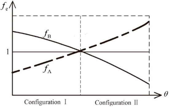 In the operation of the metamorphic mechanism, each configuration is associated with a specific metamorphic joints that engages in relative movement, while the remaining metamorphic joints stay fixed. Utilizing the equivalent resistance gradient model outlined in Figure 3 and detailed in reference [31], we present the equivalent resistance gradient diagram for a 2-DOF metamorphic mechanism in Figure 5. The term denotes the equivalent resistance gradient coefficient, defined as the ratio between the constraint force exerted by the metamorphic joint and the actual force encountered during the specific working configuration; signifies the angle of rotation or displacement [30].