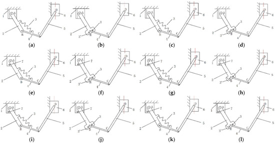 As shown in Figure 6a,b, there are only spring force constraints but no geometric constraints at the joint of the mechanism, which deselects them. Since the form combinations of the metamorphic joints at joint A controlled by the spring force are not as reliable as that of Figure 6c in the configuration transformation, the mechanisms of Figure 6e–h were not considered. When it comes to Figure 6i–l, the structural simplicity of joint is not as good as that of Figure 6c, and they were not considered for selection.