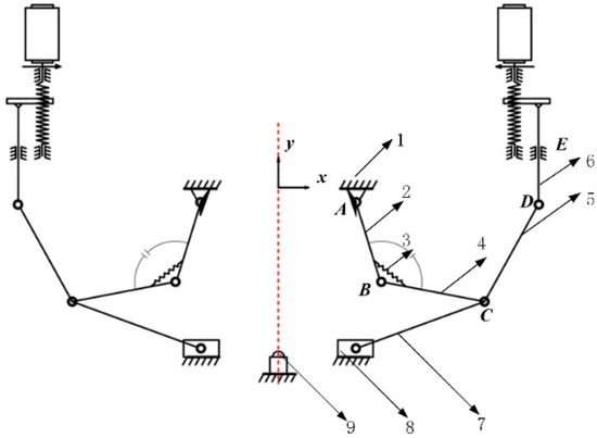As shown in Figure 11, when the mechanism remains in configuration II, due to the geometric limit, becomes a part of the frame, and . When the mechanism is kept in configuration II, the degree of freedom of the mechanism is one. , , and are known; is the input parameter; , , and are unknown.