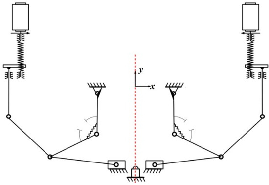 Taking the compactness of the metamorphic mechanism as the design basis, the key structural parameters of the side-rolling mechanism were preliminarily determined as shown in Table 1. In addition, the three-dimensional model of the side-rolling mechanism is shown in Figure 9. The optimization process for the mechanism’s dimensional parameters is thoroughly detailed in reference [32] and thus will not be reiterated herein. An objective function approach was employed with the aim of minimizing the motor torque subject to the specified rolling force.