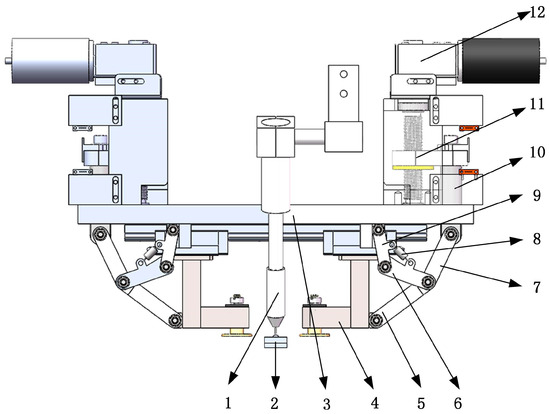 Schematic diagram of double-sided rolling metamorphic mechanism. 1, welding gun; 2, substrate and weld bead; 3, frame; 4, side-rolling slider; 5, link 4; 6, link 2; 7, link 3; 8, spring; 9, link 1; 10, drive link; 11, ball screw pair; 12, drive motor.