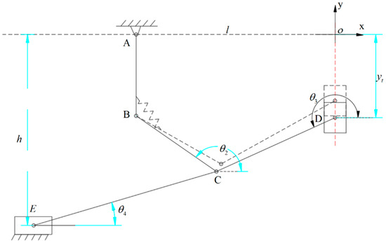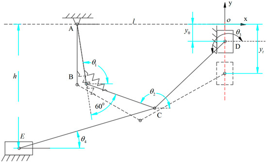As shown in Figure 10, a plane coordinate system of working configuration I was established with the lower end face of the slider, the central axis along the guide rail as the axis, and the central axis of the driving link as the axis. The and axes intersect at . The active link is simplified as a slider, its downward movement speed is , and the motion law of the slider is , where is a fixed value, which is the initial position of the slider. represents the link length, i.e., . represents the angle between the positive direction of the axis and . The angle is positive in the counterclockwise direction and negative in the clockwise direction. When the mechanism remains in the configuration I, the degree of freedom of the mechanism is one. , , and are known; is the input parameter; , , , and are unknown; and the angle between and is relatively fixed, in which case .