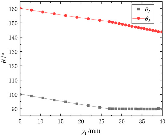 According to Equations (5)–(20), the relationship between and is shown in Figure 12. The value of the key kinematic parameters is listed in Table 2.