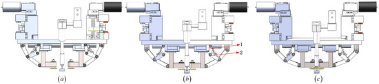 The whole working process of the side-rolling mechanism is shown in Figure 13. When working, the drive motor is driven by the ball screw pair to drive the drive link to linear movement. Figure 13a shows the configuration I. At this point, and are held together by a spring and geometric limit. Figure 13b shows the switch between configurations in which contacts the geometric limit on the frame and becomes part of the frame. Figure 13c shows the configuration II. At this time, with the movement of the driving link, begins to rotate around the joint between and after overcoming the spring resistance, thereby driving to further move and pushing the side-rolling slider to further move.