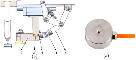 Pressure sensor installation drawing. (a) 1, side-rolling slider; 2, pressure sensor; 3, pressure sensor pressing block; 4, universal joint; 5, link. (b) The miniature load pressure sensor.