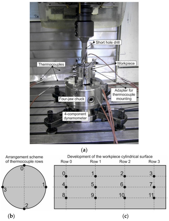 Test set-up for analyzing the drilling process: (a) experimental stand for measuring thermal characteristics; (b) arrangement scheme of thermocouple rows; (c) arrangement scheme of thermocouple layers; (d) short hole drill.