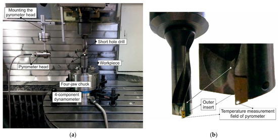 The test set-up for temperature measurement on the lateral clearance face of the drill outer cutting insert is shown in Figure 4. The temperature was measured using a high-speed pyrometer (see Section 3.1.1) that was fixed onto the machining center body—Figure 4a. The measurement area was the lateral clearance face of the outer insert, to which the pyrometer measurement field signal was directed (see Figure 4b). Figure 4c illustrates the scheme of the temperature measurement process at the specified location. A special workpiece shape with a pre-milled slit was used for the measurement (see the initial state of the workpiece in Figure 4c). During the drilling process, the workpiece slit was uncovered (see the final state of the drilled workpiece in Figure 4c). As soon as the lateral clearance face of the insert was visible through this opened slit during the drilling process, the corresponding temperature signal was recorded by the pyrometer [72].