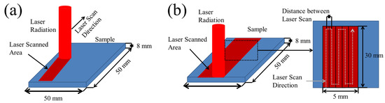 The width and length of the laser-treated zones were the same for all samples, being 5 mm and 30 mm, respectively. The schematic drawing of the first (Figure 1a) and second (Figure 1b) step processes can be seen in Figure 1.