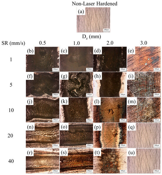 Figure 2 displays optical microscopy images of the sample surfaces. The laser-hardened samples exhibited varied aspects, revealing evaporated, molten, oxidized, and intact surfaces. The absorption of laser radiation triggers the excitation of valence electrons within the metallic material. Upon laser exposure, these electrons undergo de-excitation and collide with electrons from adjacent layers, resulting in material heating [14,15]. Depending on the absorbed laser energy, the metallic material can experience a range of states, from heating to melting or even evaporation. The laser energy density (Ed) is directly proportional to the power and inversely proportional to the defocused laser beam diameter and scan rate, as depicted in Equation (5) [33,34]: