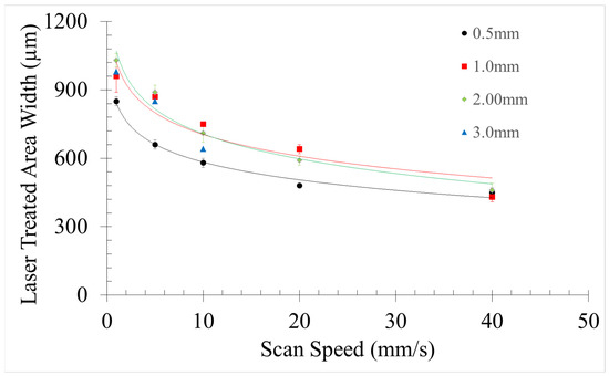 Graph of the laser-treated area width in function of the scan rate for each defocused laser beam diameter.