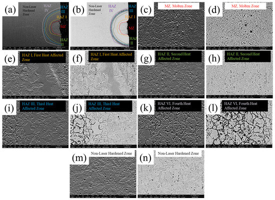 The cross-sectional views of the laser-hardened samples are depicted in Figure 5, revealing that certain laser process parameters, such as those at 2.0 mm and 2.0 mm with scan rates of ≥20 mm/s and ≥10 mm/s,, respectively, did not result in any observable microstructural alterations. This lack of microstructural change can be attributed to the inadequacy of the respective Ed values to induce significant modification, as Ed is inversely proportional to both DZ and SR, as previously discussed. The variety of microstructures observed in the laser-hardened samples was contingent upon the specific laser parameters employed. HAZ II, III, and IV were consistently present in all laser-hardened samples, while the occurrence of HAZ I was limited to instances with ≤1.0 mm (Figure 5a,b,e,f,i,j,l–o) and at 2.0 mm with 1 mm/s (Figure 5c) and 5 mm/s (Figure 5g).