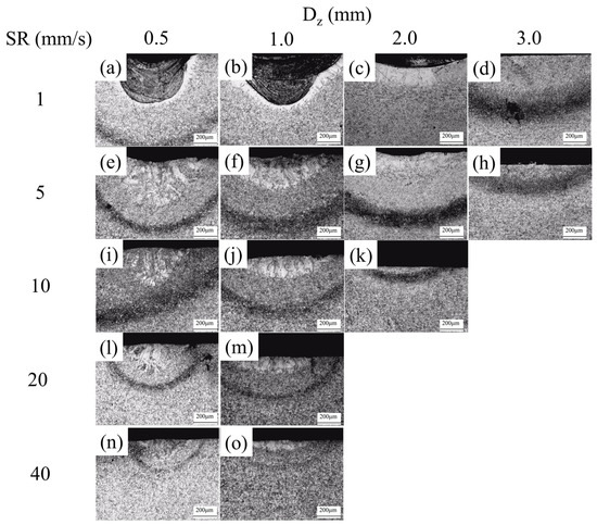 The influence of laser parameters on the width of the laser-molten surface (Wm) is illustrated in Figure 3. Increasing scan rate (SR) led to a reduction in Wm, while enlarging the defocused laser beam diameter (Dz) increased Wm, particularly at low speeds. However, at higher SS, the area was smaller with larger Dz. The spatial energy distribution of the laser beam adheres to a Gaussian pattern, with Wm determined by Equation (6) [35].