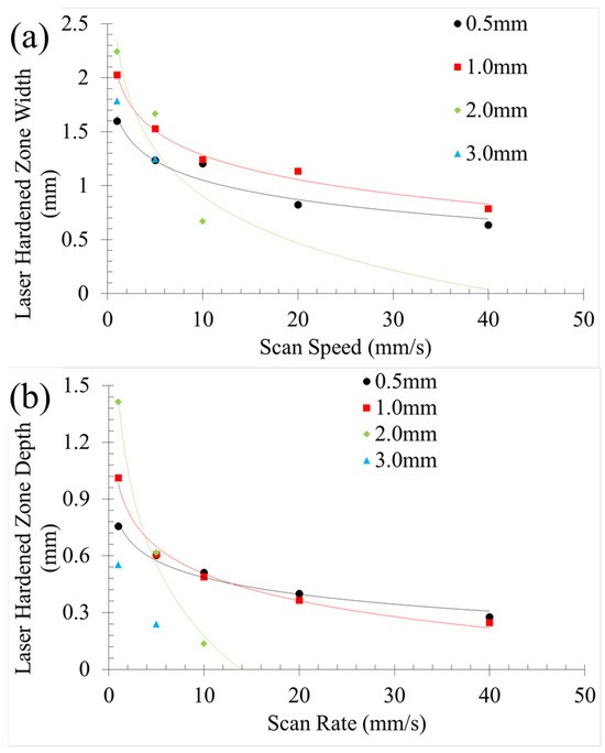 The dimensions of the laser-hardened zones exhibited notable variations corresponding to changes in the scan speed (SS) and defocused laser beam diameter (DZ), as visually represented in Figure 6. Specifically, the width (W) and depth (DL) of the laser-hardened zones experienced exponential reductions with the increment of both parameters. The interplay between these laser-parameters plays a pivotal role in defining the extents of the laser hardened zones, as elucidated through Equations (5) [33,34], (8) [7,42], 10 [35], and (11) [35].