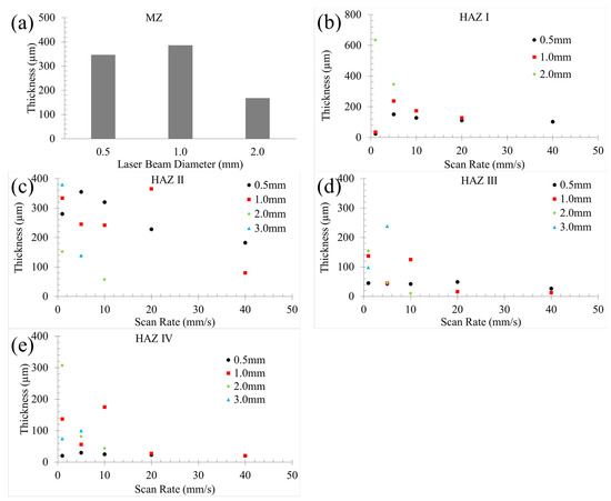 Thickness of the molten zone (a), first (b), second (c), third (d) and fourth (e) heat affected zone in function to defocused laser beam and scan rate.