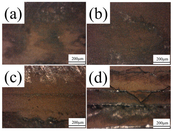 The surfaces subjected to overlapped laser scans exhibited a reddish hue (Figure 8), signifying the occurrence of thermal oxidation during the laser processing, as elaborated upon subsequently. This reddish hue was heterogeneous, indicating a non-homogeneous oxidation of the material. This can be due to the overlapping that modifies the oxidation grade. The limits of the overlapping areas featured crests due to the accumulation of the molten material on the scan edge. Notably, surfaces that underwent laser hardening with a 75% scan overlap displayed cracks (Figure 8d), which could be attributed to the thermal stress induced by increased thermal input [43]. The increase in thermal input, resulting from higher scan overlapping, is known to contribute to the development of thermal stress cracks [24]. These cracks were also extended to all areas and even between overlapped scans.