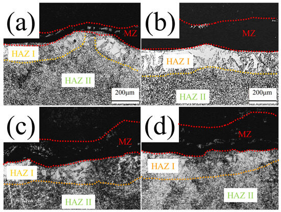 The impact of overlap on hardness was evident in MZ and HAZ III, particularly at ≤50% overlap, and could be traced back to distinct mechanisms. In the case of MZ, its hardness was proportional to the refinement of its microstructure, which in turn was influenced by overlap [2]. The effect of overlap on the hardness of HAZ I, III, and IV was relatively minimal due to inherent microstructural characteristics. However, for MZ and HAZ II, overlap exhibited a noticeable influence on hardness at ≤50%. This effect stemmed from different mechanisms. In both cases, an increase in overlap led to microstructure refinement, resulting in greater material hardness [32]. However, excessive overlap, as observed in samples produced with 75% overlap, could induce thermal cracks that subsequently reduce material hardness [24].