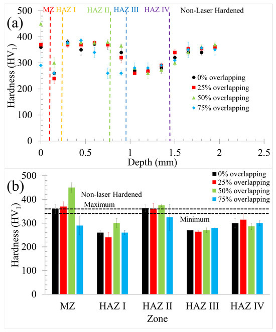The Vicker hardness of the samples demonstrated variations based on both the depth of the laser-processed zone (characterized by the microstructure type) and the degree of scan overlap, as illustrated in Figure 10. The hardness profile exhibited fluctuations with respect to the depth of the laser-processed zone (Figure 10a), primarily driven by the inherent microstructural properties that governed the material’s hardness (Figure 10b). It is noted that the hardness of zones (Figure 10b) was calculated with all measurements of the zone. The laser-hardened zones were defined using the optical microscope of the hardness measurement device. This was possible because the samples were etched.