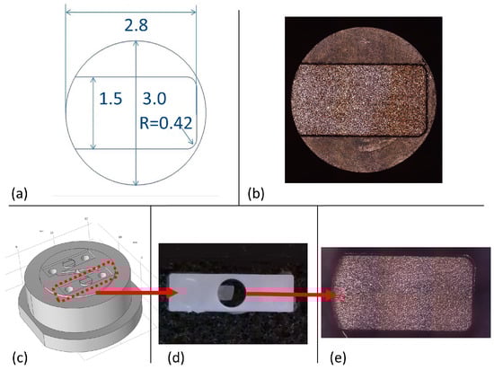 Cavity and mold design (a,c), machined cavity (b), molded sample (d), and studied molded micro part (e).