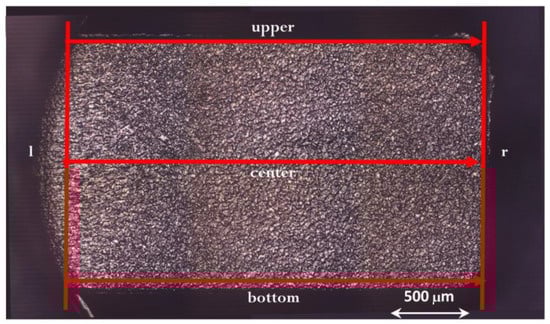 The uncertainty evaluation has been performed by measuring the length of molded plates corresponding to the micro feature shown in Figure 1 along three axes parallel to the melt flow and expanding from the gate until the end of the filled section, along the upper and the bottom edges and the center of the micro-plate, as shown in Figure 3 and marked by red arrows. Measured values were checked for outliers by implementing Chauvenet’s Criterion. Successively, a Winsorization is applied to replace outliers due to measurement and acquisition errors [31].