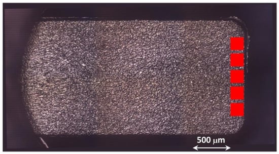 In addition, to evaluate the uncertainty sources’ contribution in measuring one-dimensional quantity (sample length, as shown), the uncertainties were also assessed by measuring a surface characteristic such as the surface roughness of the sample. Figure 4 shows the five red areas used for measurement; each area is equivalent to the microscope field of view, 117 µm × 94 µm, at the observation setting. These areas are the last filled regions by melt flow. Thus, they present the most variable surface characteristics due to the difficulty of the polymer in flowing and correctly filling the last thin section before solidifying [32].