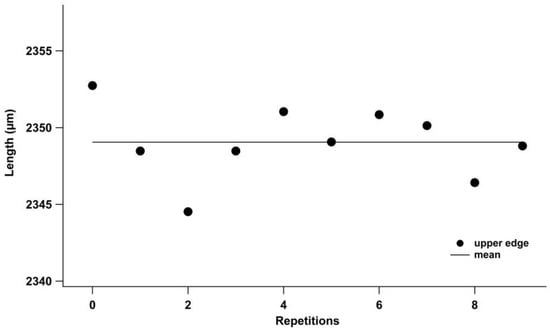 The first uncertainty is due to the operator and was evaluated by the lengths of 10 repeated measurements on a single sample, randomly chosen, along the upper edge (Figure 5); the mean value and standard deviation are 2349.054 µm and 2.360 µm, respectively, and the evaluated uncertainty is u0 = 0.746 µm. It must be pointed out that also for an expert operator, the absolute measured value ranges from about 10 µm, almost ten times higher than the spatial x–y resolution (0.909 µm) of the microscope in the adopted setting. This gap is mainly due to the difficulty in distinguishing the edges of the sample to measure. The last filled part of the micro-plate has many irregularities due to the polymer flow’s efforts to fill the cavity when it has increased its density due to the forthcoming freezing. These irregularities exhibit different slope surfaces that do not allow a regular light reflection under the microscope and contribute to making undefined part edges. To better consider this difficulty as an uncertainty source, measurements were performed by varying reference lines on the edges.