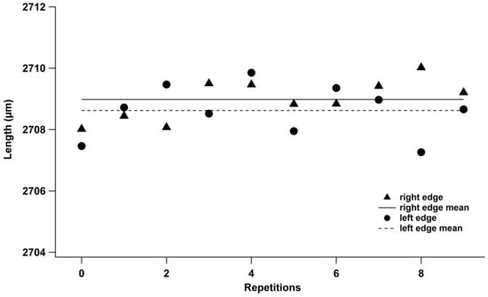 Figure 6 shows the repeated measurements on a single sample performed by fixing one extreme line and varying the other and vice versa, named left (l) and right (r), respectively. This procedure accounts for the uncertainties that could arise from slight variations in positioning the cursor on the screen to define the limit of the sample. The mean values obtained are 2708.621 µm and 2709.980 µm, respectively, with the corresponding standard deviation of 0.853 µm and 0.660 µm. The related uncertainties are 0.270 and 0.209, giving a combined uncertainty of ux = 0.341 µm. The patterns do not show a trend; hence, the independence of the measurements could be accepted. It is to be noted that this uncertainty is less than the previous one, which is also due to the operator.