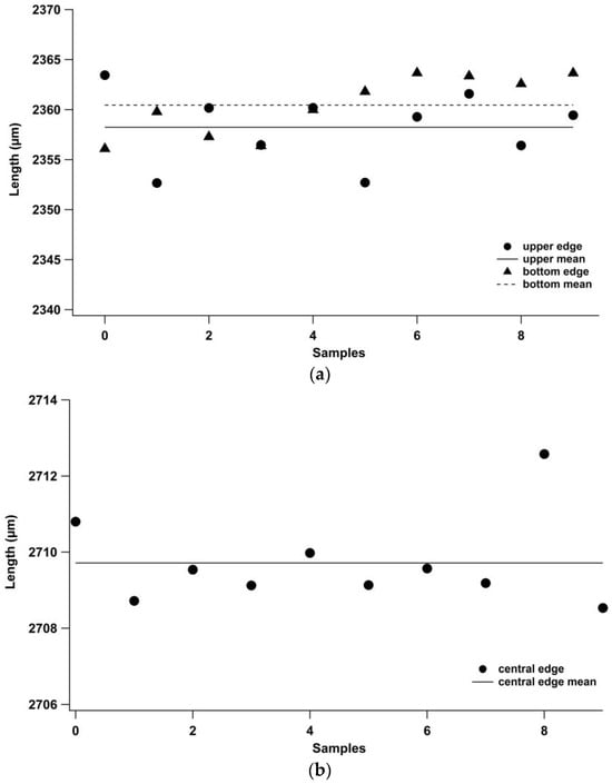 Then, the lengths of ten randomly chosen samples were measured and displayed in Figure 7; these samples were measured along the upper, bottom (a), and center (b) lines. Results are summarized in Table 2. It is to be noted that the standard deviations of the length measured along the edge having a filler radius (upper and bottom) are more significant than those evaluated on the central line due to the difficulties of fixing the reference setting during measurements at the rounded edge. However, the corresponding uncertainties are more effective than the just considered ux, accounting for the positioning during the measuring. Hence, it could account for the real variation of the sample size along the edge; the progress of the melt flow on the edges is certainly more hindered in comparison to the center due to the presence of the mold walls (melt flow fountain is the progress model of the flow in the cavity) and hence a more considerable variability in its paths is expected.