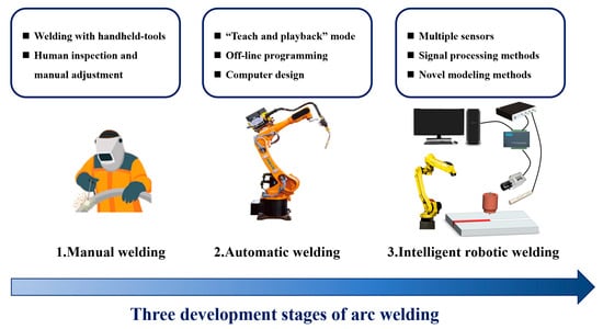 Arc welding is the common method used in traditional welding, which constitutes the majority of total welding production, and is commonly applied in automobile production, shipbuilding, and other fields [1]. Although most precision welding still requires manual labor, the traditional manual and manual teaching welding method has problems with high labor costs and limited efficiency when faced with mass production. Intelligent welding technology is an effective idea proposed to solve this problem, which has become an important research direction in the development of welding technology. Figure 1 shows the various stages in development that arc welding has undergone. During the initial stages, welding was carried out manually, resulting in the welding quality being heavily reliant on the theoretical expertise and practical experience of the technicists. Then, the advancement of robot technology led to the gradual substitution of manual welding with industrial welding robots, representing the second stage in automated welding. Industrial robot welding enables efficient welding in challenging areas that are impossible for human welders [2]. But the majority of welding robots continue to operate using manual teaching methods. In the actual welding process, the errors of equipment, preprocessing process, and environmental factors must be considered, and weld identification and defect detection still rely on manual examination and training [3]. Aimed at these problems, the application of different sensing technologies has made intelligent robotic welding possible [4]. Sensing technologies have been demonstrated to have remarkable effectiveness in recognizing welding environments, monitoring the plasma welding process, and detecting weld defects [5].