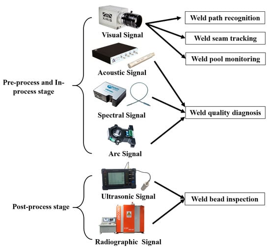 The sensing information introduced in the previous chapters has its own advantages and disadvantages in different fields. As shown in Table 1, the signal characteristics and main application fields of each sensor are summarized. In view of the real-time capabilities of the signal, they can be divided into dynamic process monitoring and post-weld detection. The dynamic process monitoring-related technologies are the focus of research to achieve intelligent welding, while post-weld inspection technology is the basis for scientific research and experimental proof.