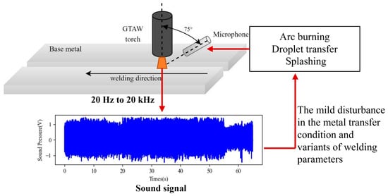 Experienced welders can rely on variable sound to judge the welding condition in the welding process. Several studies have found that acoustic data from arcs is essential in determining the quality of welding [16]. The frequency range of 20 Hz to 20 kHz, which falls inside the audible sound band, is frequently employed for monitoring robotic arc welding. Figure 4 shows the mechanism of sound sensing technology; the source of sound in the arc welding process is the alteration of energy in the arc column, which involves the auditory manifestations of arc burning, droplet transfer, and splashing. Arc sound signals can detect even small changes in the metal transmission condition and variations in welding conditions. So, the acoustic sensing has rapidly developed as an essential tool for monitoring welding processes in real time. Research has found that sound can accurately monitor and predict the weld pool [17], arc length [18] and welding defects [19]. In current research, dimensionality reduction and feature extraction from acoustic information are mainly based on the Fourier transform, combined with the analysis of the time–frequency domain of the welding arc sound signal, to extract features of interest that are highly correlated with the target.