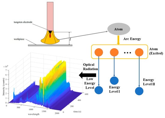 The arc spectrum is a noncontact sensing information from arc emission, which shows good sensitivity to dynamic welding processes and weld defects [22,23]. Welding data are abundant in the arc spectrum. In comparison to other sensing technologies, its advantage lies in its ability to monitor the alterations of elements in the arc atmosphere. Figure 5 shows the arc spectrum mechanism. The line spectrum of metallic and nonmetallic elements is derived from the welding base metal, welding wire, and shielding gas, including aluminum, hydrogen, and argon. Variations in the concentration of these elements can indicate the stability in the welding process and the diffusion of elements, both of which are connected to the formation of porosity defects. Recently, spectral signals have been extensively employed for monitoring welding defects such as porosity [24] and burning-through [25]. Feature extraction of spectral signals must first combine the welding process and defect formation mechanism to determine the elements with high correlation, and then further combine the spectral emission mechanism and theoretical calculations to reduce the information dimension. The noise and continuous background spectrum interference in the original arc spectrum are also important research topics in this field.