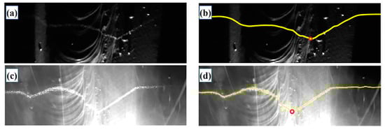 The result of the extraction algorithm under significant noise interference: (a) in low brightness; (c) ruined by arc; (b,d) extraction results (the yellow line) from (a,c), respectively [44].