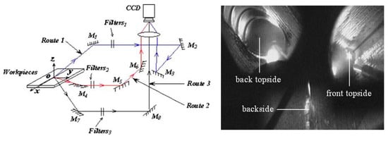 The monitoring of the molten pool morphology mainly relies on passive visual sensing. The detection information includes molten pool morphology, backside molten width, molten pool stability, and monitoring the penetration status of the weld and some common defects (welding leaks, wrong edges, lack of fusion, etc.). Wu et al. [50] proposed a passive visual sensing system to monitor the penetration status during variable polarity plasma welding. As shown in Figure 8, Fan et al. [51] constructed a multioptical path vision-sensing monitoring system to achieve synchronous monitoring of the front and back molten pool shapes during the aluminum alloy welding process.