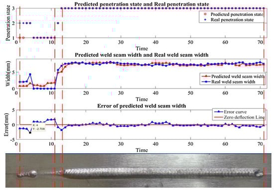 As mentioned above, visual sensing technology can collect rich welding pool information in real time. Through the geometric feature and stability of the molten pool, the penetration status can be monitored and the surface defects of some welds can be predicted. Chen et al. [55] extracted the visual features which contributed to the penetration prediction by a multiangle visual system; the prediction result is shown in Figure 9. Feng et al. [56] proposed a deep welding framework for penetration classification based on the combination of active vision and passive vision. Li et al. [57] proposed a real-time sensing system based on photoelectric conversion for a pulsed-gas tungsten arc welding process. By using an illumination laser and a photoelectric conversion chamber, the weld pool oscillation frequency can be measured in real time with high sampling rate, high processing speed, device simplicity, and ability to completely meet the requirement of real-time measurement in the actual welding process. Shi et al. [58] used a low-power five-line laser pattern and a high-speed camera to observe and analyze the change in the captured laser images during the base welding current period. They developed a novel image processing algorithm for extracting the pool oscillation frequency, which demonstrated good robustness and effectiveness, and could be used to monitor and control weld joint penetration in real time.