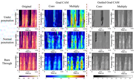 Through feature extraction and data analysis of the welding sound information in the time–frequency domain, rich welding process information can be obtained for online diagnosis of various welding defects. The arc sound signal’s mechanism was explained by Chen et al. [59] through the introduction of an arc sound excitation model. A DLSTM network was put forward to achieve the accurate penetration prediction by employing a nonlinear arc sound model. Zhao et al. [60] researched the feature of arc sound, an adaptive extraction model was put forward and proved. Through Grad CAM and guided Grad CAM, the regions of interest for arc sound under different penetration states were visualized (Figure 10). An innovative classification model, called SVM-GSCV, for identifying under penetration, normal penetration, and burning-through by arc sound signal, is presented by Zhang et al. [61], which combined the support vector machine with grid search optimization and cross-validation. The suggested model is highly effective and robust, as shown by the verification results for various welding currents and plate shapes, where the test accuracy varied from 81.52% to 98.46% using wavelet-based filtering PCA and SVM-GSCV.