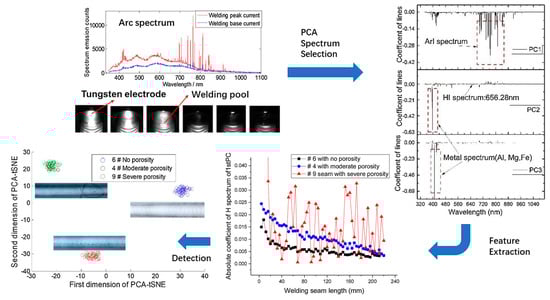 - Zhang, Z.; Zhang, L.; Wen, G. Study of inner porosity detection for Al-Mg alloy in arc welding through on-line optical spectroscopy: Correlation and feature reduction. J. Manuf. Process. 2019, 39, 79–92. [Google Scholar] [CrossRef]