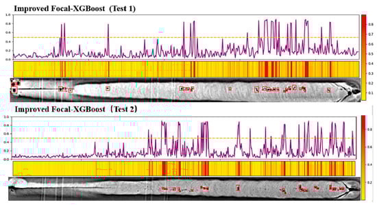 Prediction results for the porosity defect position using the improved Focal-XGBoost model (two experiments), the yellow line is the threshold for judging porosity defects [69].